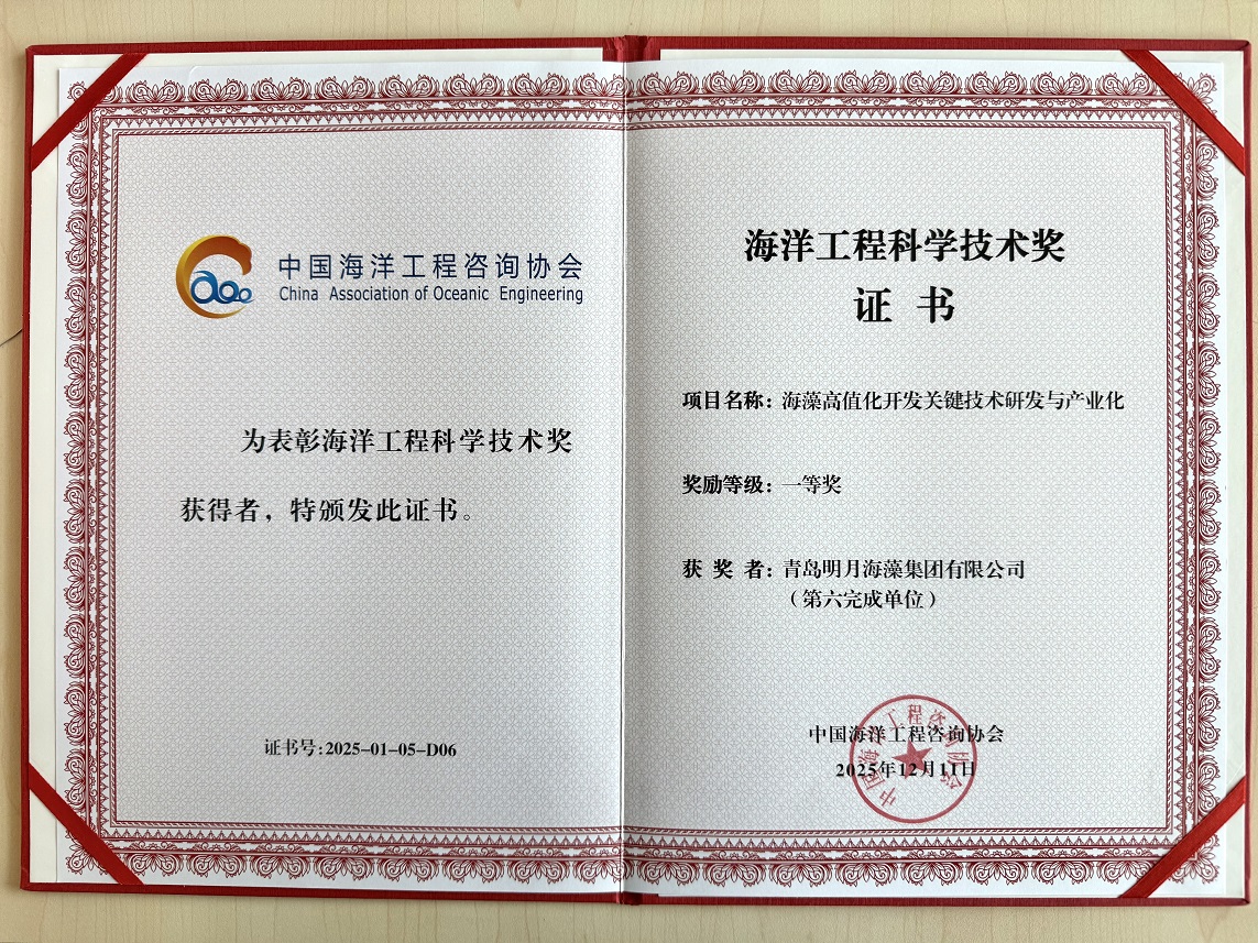12月,明月海藻集團榮獲"海洋工程科學技術獎"。