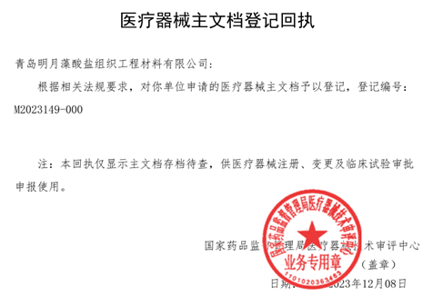 截至目前已有313家企業(yè)在器審中心進行了主文檔登記,我公司為首家藻酸鹽類醫(yī)療器械原料主文檔登記企業(yè)。主文檔登記公示后,使醫(yī)療器械生產(chǎn)企業(yè)能方便的獲悉我公司的生產(chǎn)能力,擴大了在醫(yī)療器械原料領(lǐng)域的影響力。